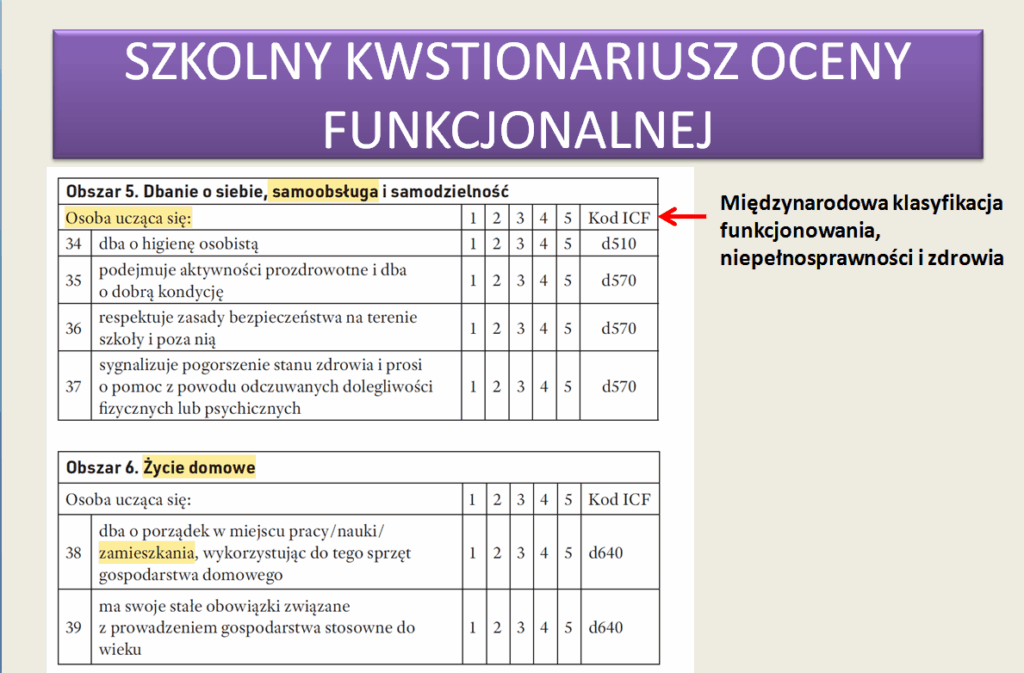 Ze Szkolnym Kwestionariuszem Oceny Funkcjonalnej można zapoznać się tutaj:  https://ore.edu.pl/2024/12/ocena-funkcjonalna-w-szkole-dla-kazdego-zalozenia-pomiar-zastosowanie/