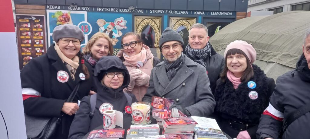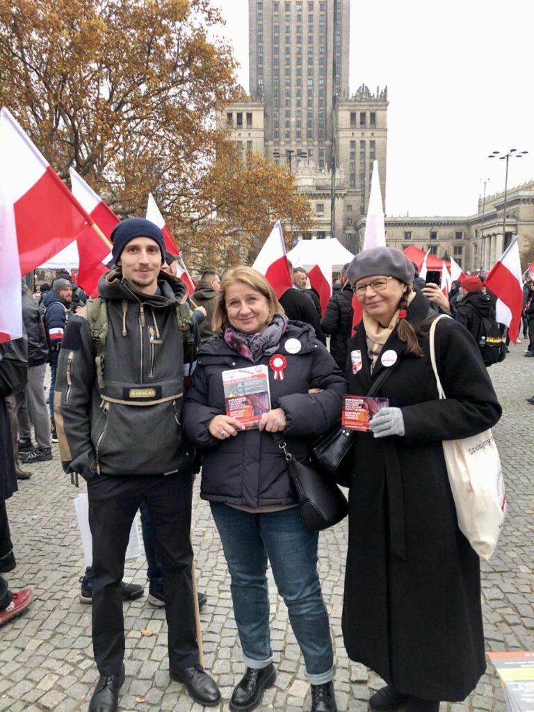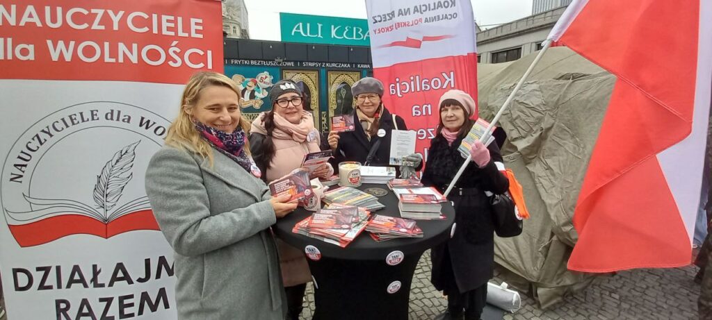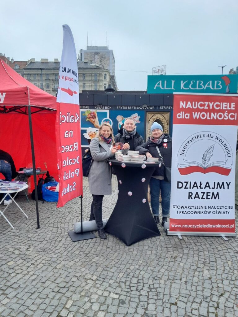 W dniu Święta Niepodległości – 11 listopada 2025 r. – wiele naszych koleżanek i kolegów ze Stowarzyszenia Nauczycieli i Pracowników Oświaty „Nauczyciele dla Wolności” wzięło udział w Marszu Niepodległości, który przeszedł ulicami Warszawy. Dzień ten stał się również okazją do zaprezentowania naszego Stowarzyszenia, w utworzonym pod Pałacem Kultury i Nauki w pasażu Wisławy Szymborskiej „Miasteczku Niepodległości”, gdzie w godzinach 9.00 – 13.00 zorganizowaliśmy stoisko wystawiennicze. Prezentowaliśmy na nim materiały informacyjno-edukacyjne, o prowadzonych przez Stowarzyszenie akcjach i przedsięwzięciach realizowanych wspólnie z Koalicją na rzecz Ocalenia Polskiej Szkoły – KROPS. Znalazł się wśród nich m.in. przewodnik Zbigniewa Barcińskiego dotyczący edukacji zdrowotnej, ulotki o zagrożeniach płynących ze zmian wprowadzanych w systemie oświaty przez ministra edukacji Barbarę Nowacką i jej resort – obniżających drastycznie poziom edukacji i prowadzących do wynarodowienia młodego pokolenia Polaków. Materiały te były w wersji dla rodziców oraz dla nauczycieli. Nie zabrakło informatorów promujących działalność naszego Stowarzyszenia i zachęcających do wspierania naszych akcji. Szczególnie jednak, korzystając z licznej frekwencji Polaków odwiedzających Miasteczko Niepodległości, rozpowszechniliśmy akcję KROPS-u polegającą na wysyłaniu kartek pocztowych do Premiera RP ze sprzeciwem przeciwko wprowadzaniu w Polsce Europejskiego Obszaru Edukacyjnego pod dyktat Brukseli.