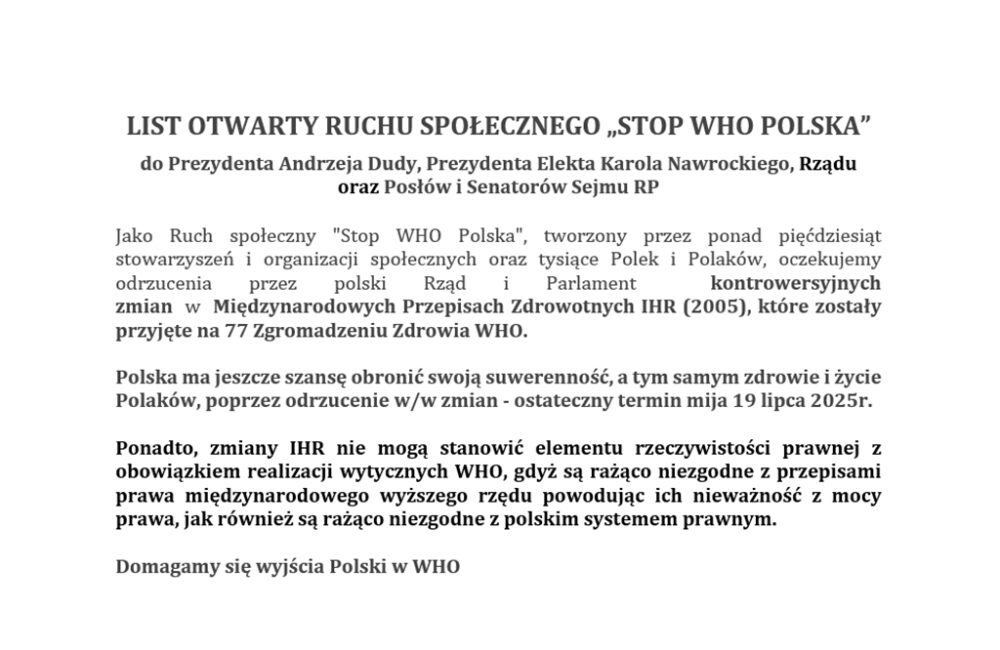 Jeśli chcecie Państwo, aby Polska została uwolniona śladem USA i Argentyny od wpływu WHO zapraszamy do działania!!! Presja ma sens!!! Pobierz, wypełnij, podpisz i wyślij dwa pisma: 1. Wezwanie obywatelskie do … Czytaj dalej Szansa na wyjście Polski z WHO – działajmy!